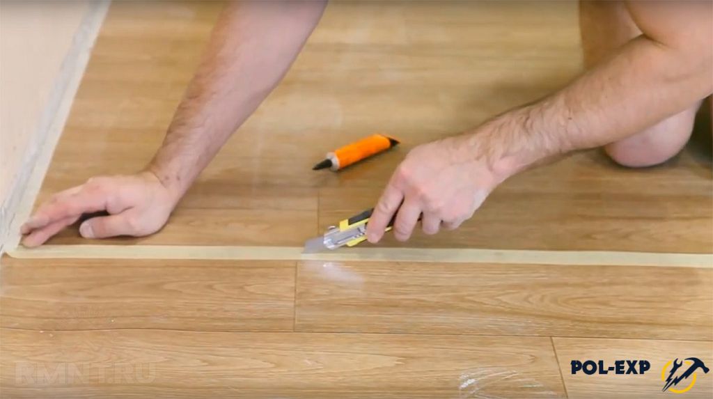 - в месте стыка наклейте на края листов линолеума широкий односторонний малярный скотч;