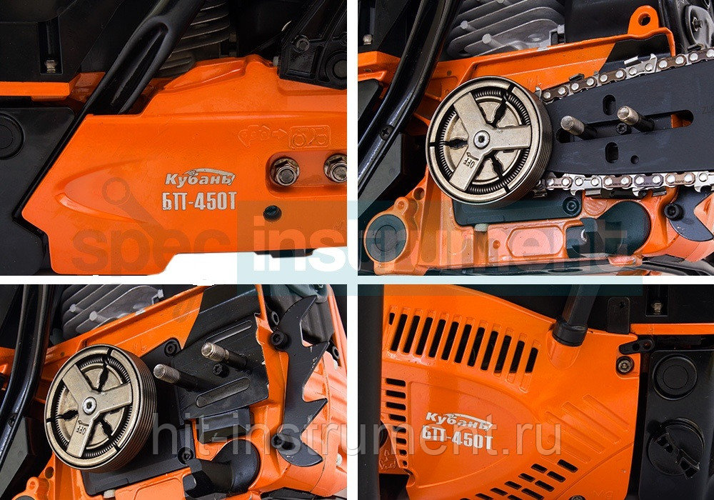 Бензопила Кубань БП — 450Т имеет мощный двухтактный бензиновый двигатель мощностью 2900 Вт, объемом 52 см3 и шину длиной 45 см, что позволяет говорить о хорошей производительности данного инструмента. Мотопила Кубань БП 450Т имеет малый вес, удобна и маневренная, что позволят работать с этим инструментом без особого усилия и опыта. Особенности устройства карбюратора позволяют двигателю быстрее выходить на рабочие обороты, а также способствуют быстрому и легкому запуску двигателя. Антивибрационная система оказывает меньшее воздействие вибрации на организм человека и делает работу с данным инструментом комфортной. К особенностям бензопилы можно отнести наличие двухтактного одноцилиндрового двигателя с воздушным охлаждением, автоматического масляного насоса, автоматической системы смазки цепи. Пила имеет эргономичный дизайн. Элементы корпуса не закрывают доступ к расходным материалам. Также она имеет двойной выхлоп, который существенно увеличивает мощность и продлевает срок ее службы. Праймер подкачки существенно уменьшает усилие пользователя, нужное для заведения бензопилы, особенно после длительного зимнего хранения. Работа с бензиновой пилой приятна и комфортна, надежна и безопасна при соблюдении правил инструкции и безопасности. Бензиновая пила имеет ряд преимуществ перед электрической пилой, а именно бензиновая пила обладает значительно большей мобильностью и более высокой производительностью. Бензопила имеет высокую мощность, малый вес, что делает ее удобной и маневренной и позволяет работать с этим инструментом без особого усилия и опыта, как домашним мастерам, так и профессионалам.