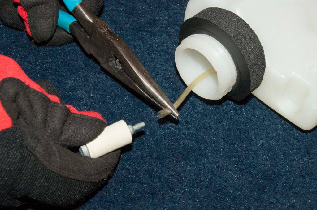 Он находится внутри бензобака, и чтобы его достать, нужно снять пластиковую защиту, затем плоской отверткой поддеть резиновую манжету, сквозь которую проходит топливопровод. Вынуть ее надо аккуратно, чтобы не повредить резину. В противном случае она будет подтекать после установки. В некоторых бензопилах фильтр достается через горловину бензобака.