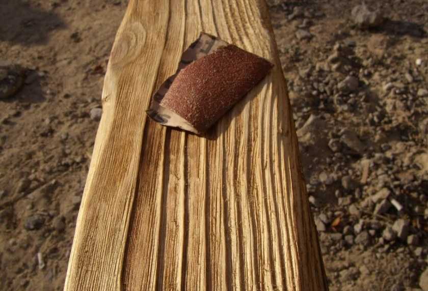 - Начальный этап – зачистка. Подсушенное дерево подвергается очистке щёткой по металлу. Для снятия верхнего слоя с мягкими волокнами подойдёт также крупнозернистая наждачная бумага.