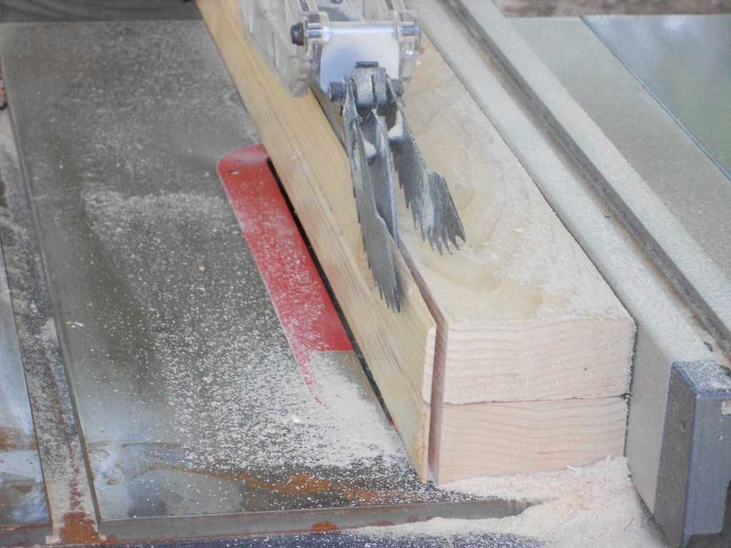 Некоторые умельцы снимают кожух с инструмента, из-за чего доступна большая рабочая поверхность диска пилы. Подготавливается и специальный брусок для толкания досок