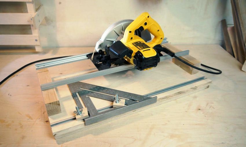 Достаточно распространённым вариантом является использование станины на направляющих. Несложная конструкция позволяет использовать инструмент для работы под любым углом. Состоит из двух параллельно установленных металлических труб или уголков, на которые установлены пила.