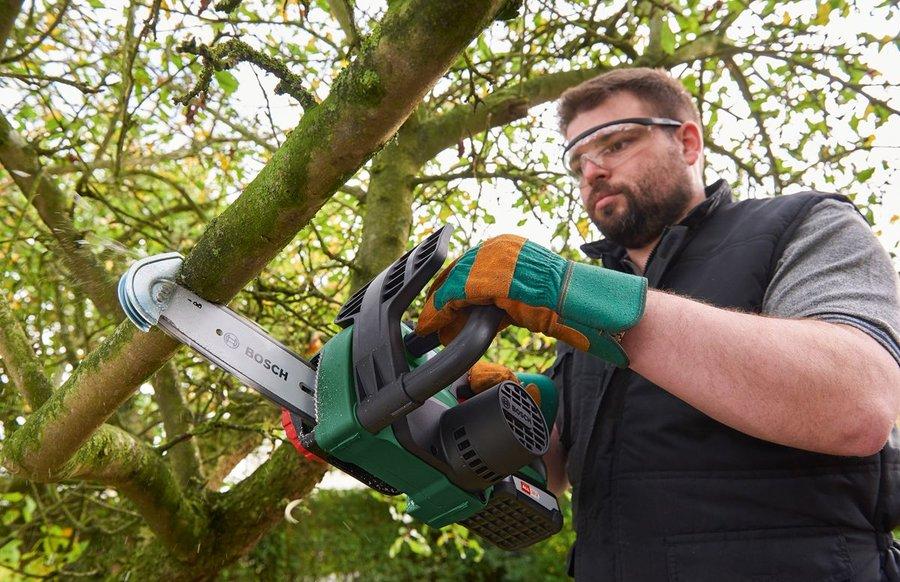 Данный инструмент при длине шины всего 20 см может похвастаться таким атрибутом «взрослых» инструментов, как шаг звёздочки 3/8. Это позволяет найти замену в любом магазине, где цепи склёпывают из бухт — главное, выбрать качественную. 18-вольтовый аккумулятор отличается традиционным для Бош качеством, но далеко не все модификации им укомплектованы. Мощности двигателя вполне хватает, чтобы осуществлять поперечный рез дров толщиной 10 — 15 см.