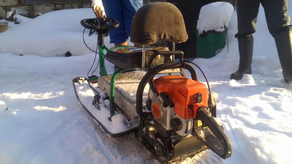 Домашние мастера сумели сделать снегоход из бензопилы. Машина состоит из следующих конструктивных элементов: