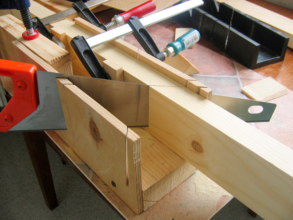 Чтобы грамотно распилить элемент необходимо тщательно подготовить материал, взяв стусло с пилой. Наличие пазов позволяет делать точные и ровные заготовки поскольку пила будет принимать установленное положение. Первым делом необходимо закрепить инструмент шурупами или струбциной на плоской поверхности. Далее с помощью карандаша или лазера сделать мини-чертеж. Заготовку помещают в лоток. При этом разметка должна стоять напротив соответствующей прорези. Затем вставляется ножовка, и осуществляется распил.