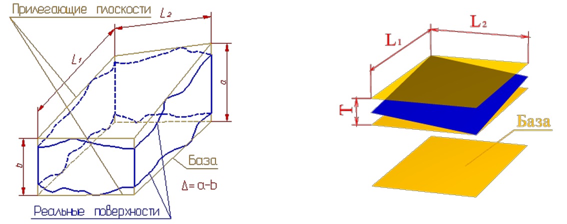 Отклонение от параллельности плоскостей — разность Δ наибольшего и наименьшего расстояний между плоскостями в пределах нормируемого участка