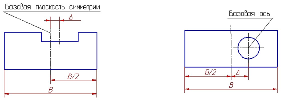 Отклонение от симметричности относительно базового элемента — наибольшее расстояние Δ между плоскостью симметрии (осью) рассматриваемого элемента (или элементов) и плоскостью симметрии базового элемента в пределах нормируемого участка.