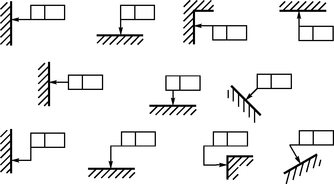 Если базой является ось или плоскость симметрии, треугольник располагают в конце размерной линии соответствующего размера поверхности. В случае недостатка места стрелку размерной линии допускается заменять треугольником.