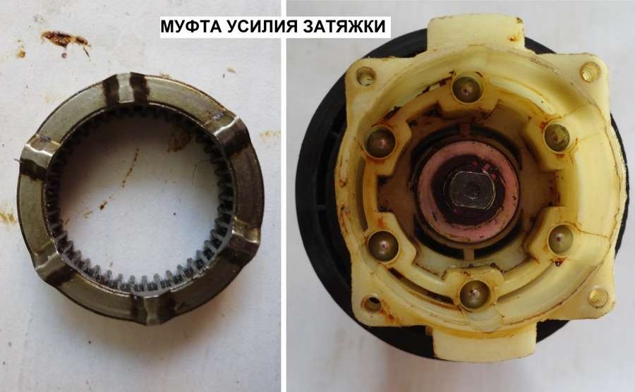 С целью защиты двигателя инструмента от его сгорания, в конструкции также применяется предохранительная муфта фрикционного типа. Ниже она представлена на фото, и срабатывает при заклинивании насадки. К примеру, выставлено максимальное усилие на регуляторе, в таком случае, если заклинит сверло, то с высокой долей вероятностью произойдет вырывание прибора из рук. Чтобы этого не случилось, используется защитная муфта, которая исключает вырывание инструмента из рук, а также предотвращает сгорание обмотки на роторе.
