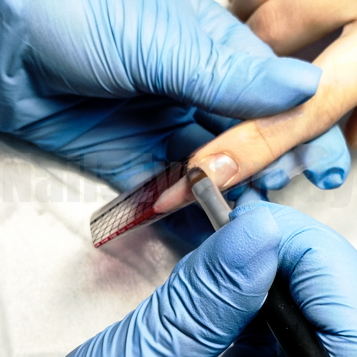 При опиле нам нужно придать ногтям одинаковую длину, форму, убрать все лишние выпуклости и неровности. Если вы видите, что где-то явно просматривается ямка, то нужно наоборот, доложить в нее материал по схеме пункта 5. Опилом недостаток материала не исправить.