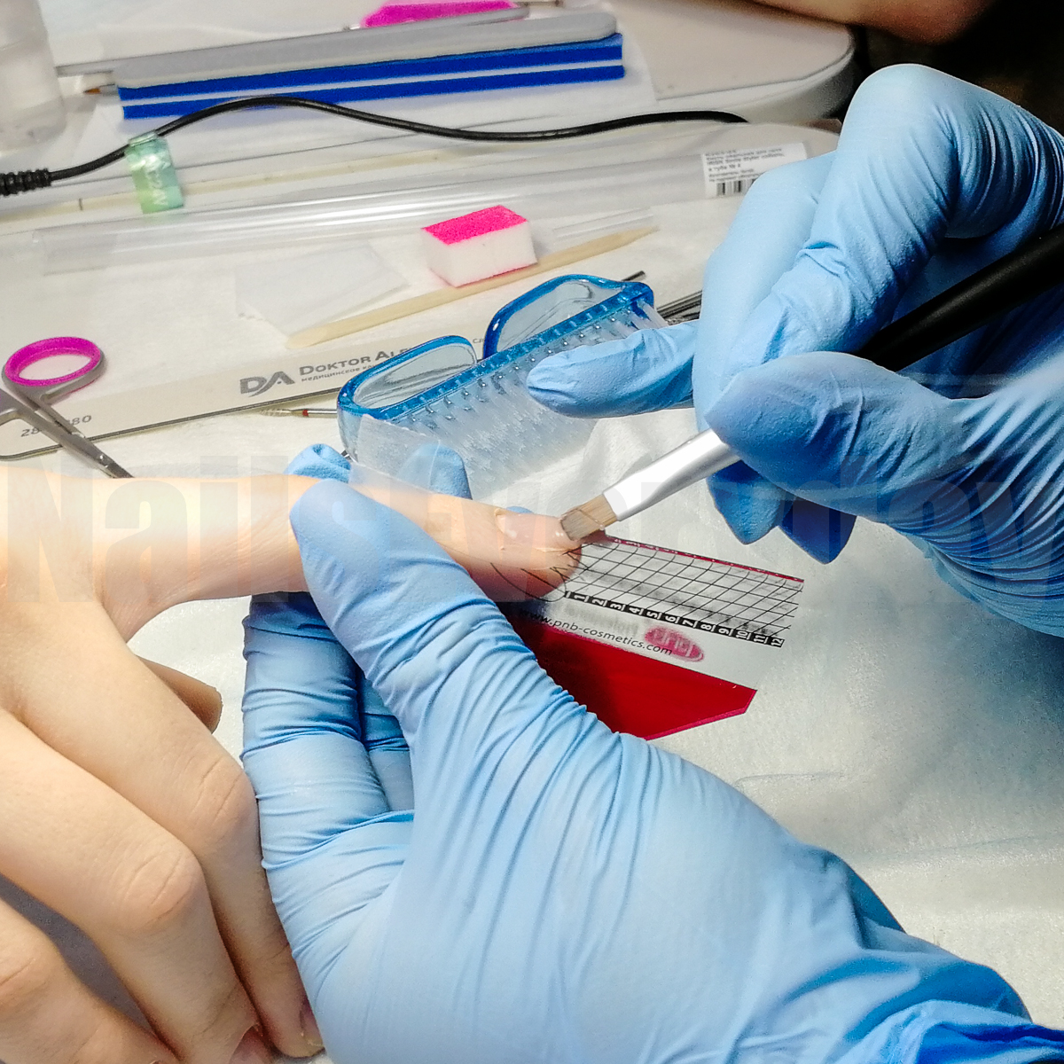 - наносится только на голый ноготь, на зону ближе к кутикуле и по боковым стенкам, так как именно с этой стороны могут пойти отслойки. Праймер сохнет на воздухе 30-120 секунд;