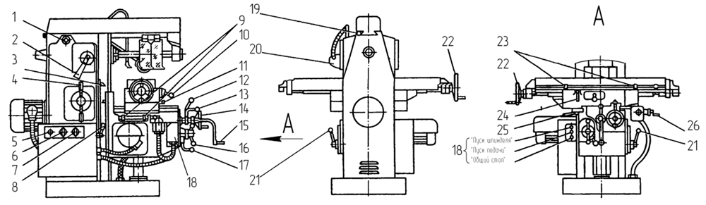 Механические продольная, поперечная, вертикальная подачи включаются рукоятками 10, 12, 13 соответственно. Механику перебора подач задействует рычаг 17. Подачи переключаются фиксируемой рукоятью 16. Ручные продольные, поперечные перемещения производят, вращая маховики 22, 14 соответственно. Для подъема – опуска консоли со столом служит съемная изогнутая ручка 15. Ускоренный ход в любом направлении включает рычаг 21.