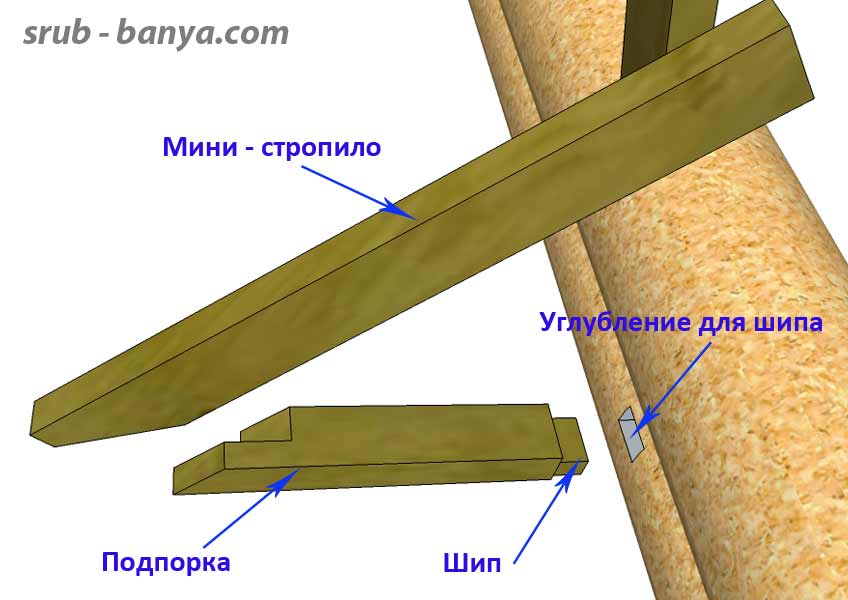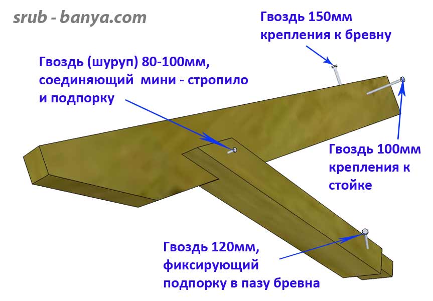 Мини стропила прибиваются к верхнему бревну, к раме окна и к стойкам передней фермы. Подпорка шипом вставляется в выдолбленное в бревне углубление и фиксируется забитым наискосок сбоку гвоздём.