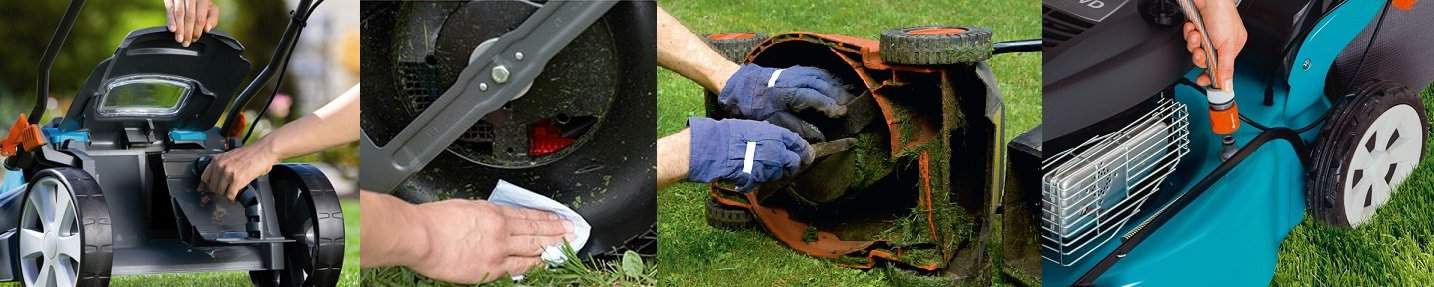 Необходимо чистить внутреннюю часть деки и корпуса газонокосилки, после каждой уборки. Ведь трава и мусор под корпусом или на воздухозаборниках, не только будут мешать последующей стрижке газона, но и могут стать причиной возгорания. Отметим, что не следует чистить с помощью химикатов, они могут сильно повредить механизмы оборудования. Многие задаются вопросом: «Можно ли мыть газонокосилку?» Можно и даже нужно, как чистящими средствами (без химии), так и водой, но аккуратно. После промывки деки (корпуса) водой, тщательно вытирайте, так как в стальных деках (в основном материал бензокосилок), хватит небольшого отслоения краски и, если оставить там влагу, ржавчины не избежать. Также изготавливают деки из алюминия (антикоррозийные) и пластика (но это больше относится к электрическим газонокосилкам).