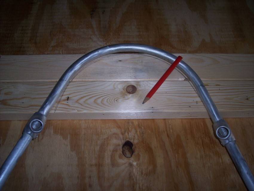 Для работы с полимерными трубами подобный шаблон можно сделать из металлических крючков, жестко зафиксированных в форме полукруга на деревянной поверхности. Однако металлический профиль такая конструкция не выдержит.