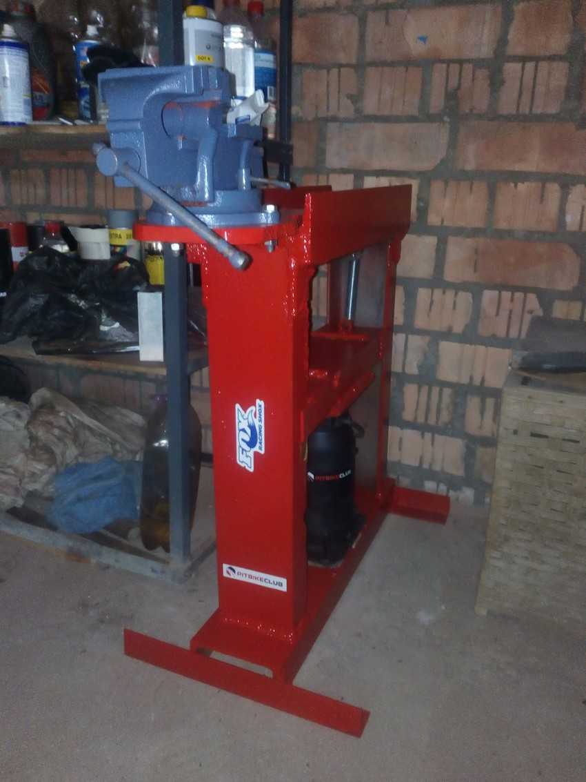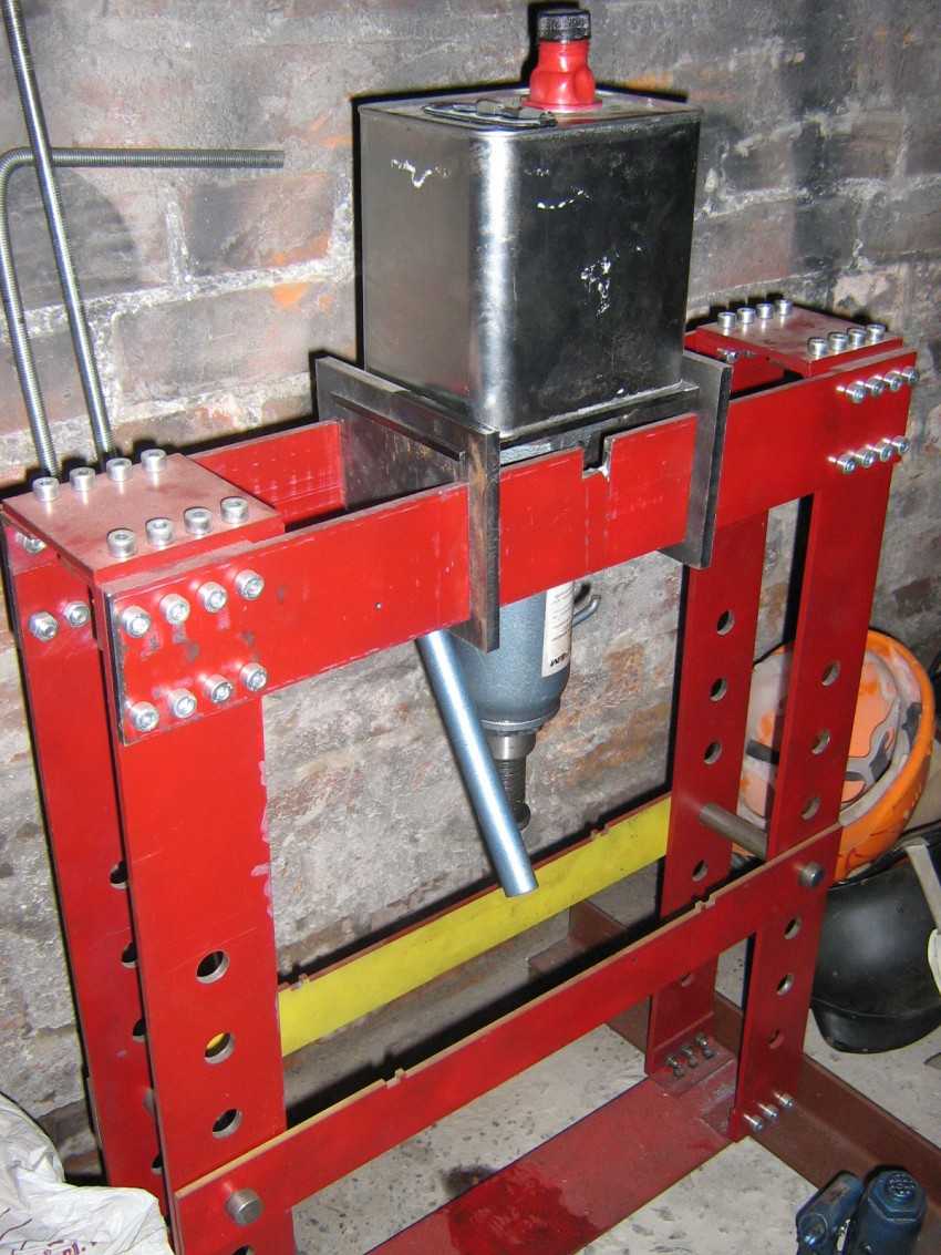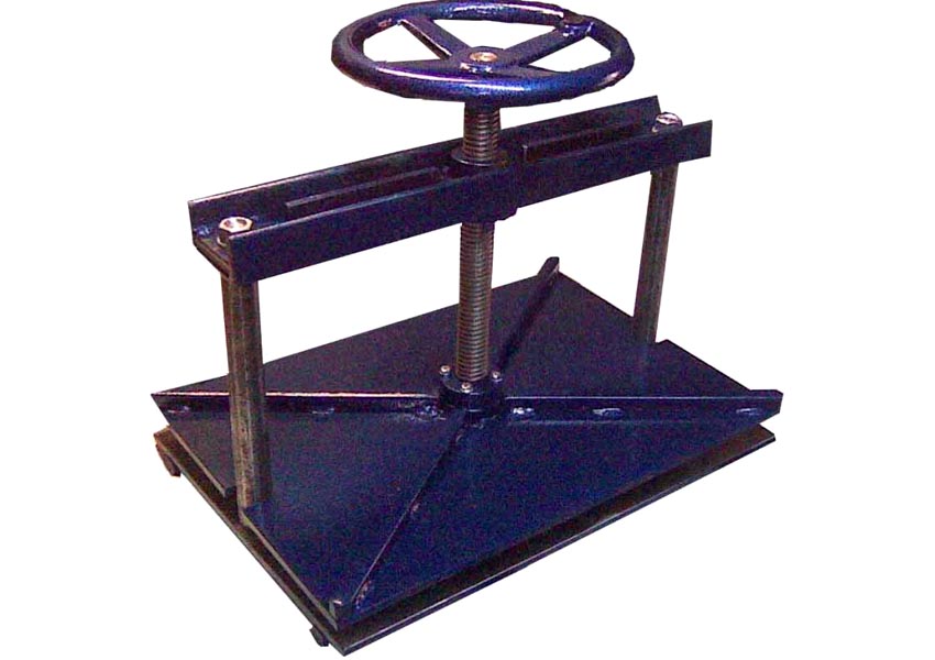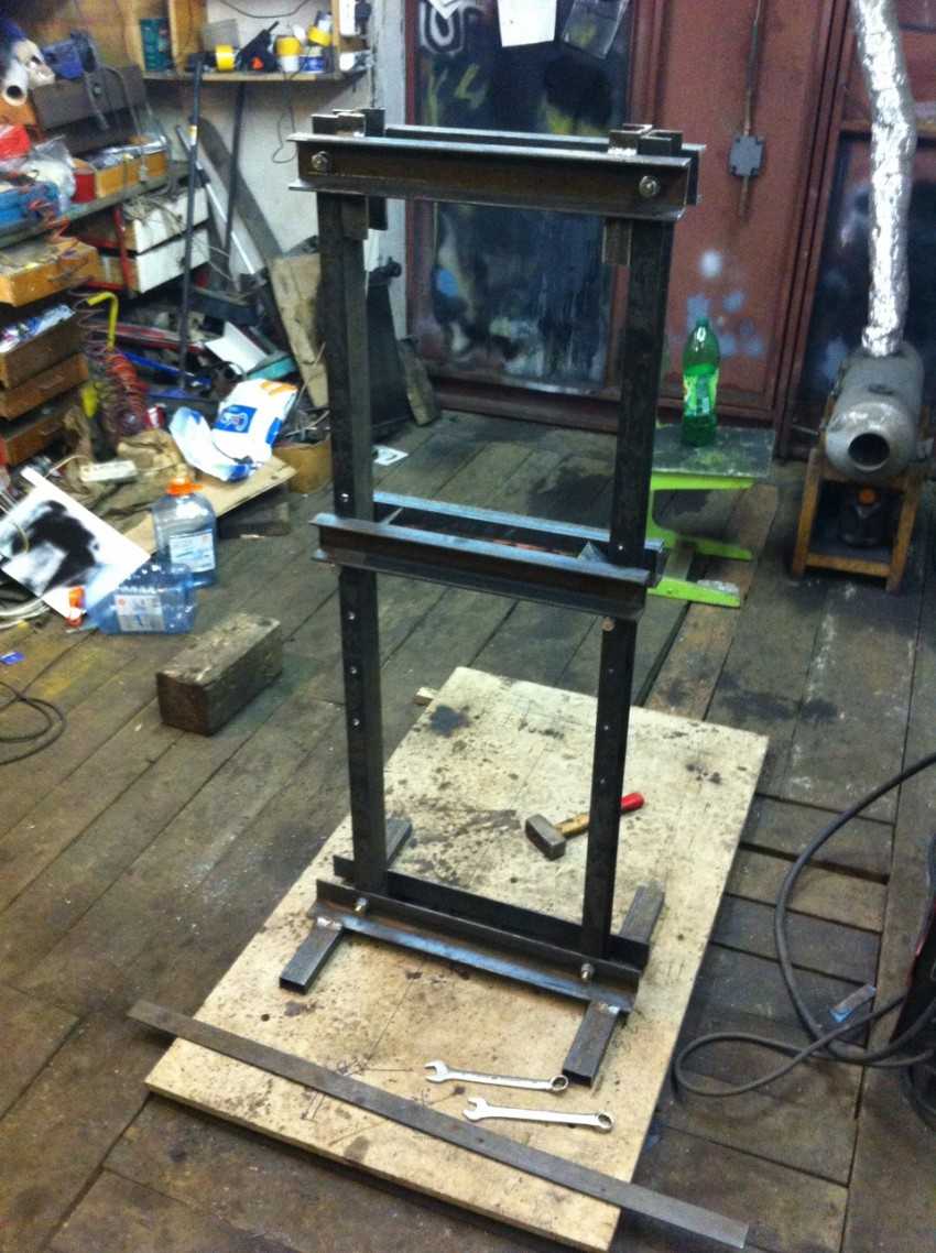 Установка выглядит в виде рамы, сваренной из железа и усиленной рёбрами для жёсткости. Такая модель делается подобно описанной выше с использованием домкрата. Помещая заготовку в нижнюю часть рамы, вращая ручку домкрата, выдавить среднюю часть.