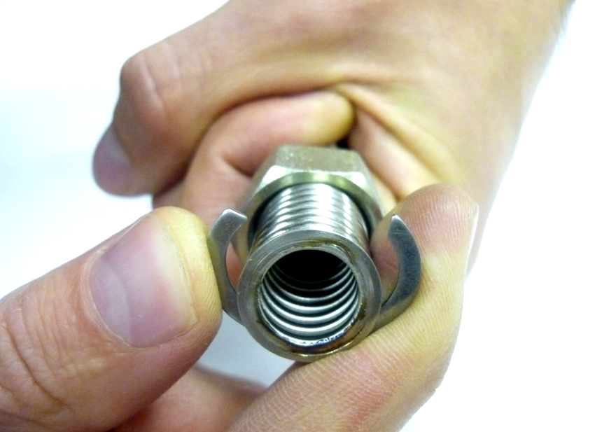 Встречная часть фитинга «папа» устанавливается по месту организации трубной связи Убедиться, что прокладка внутри встречного фитинга надёжно закреплена в гнезде. Нанести трубный герметик на коническую резьбу встречного фитинга и установить этот элемент связи в газовую систему.