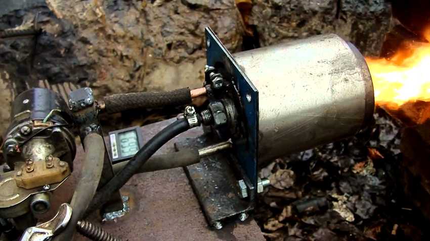 На заметку! Рекомендуется использовать компрессор от холодильника. Небольшого давления (2-4 бар) будет вполне достаточно для эффективной работы сопла. Воспламенение легко обеспечить свечами зажигания от автомобиля, стоящими у сопла.