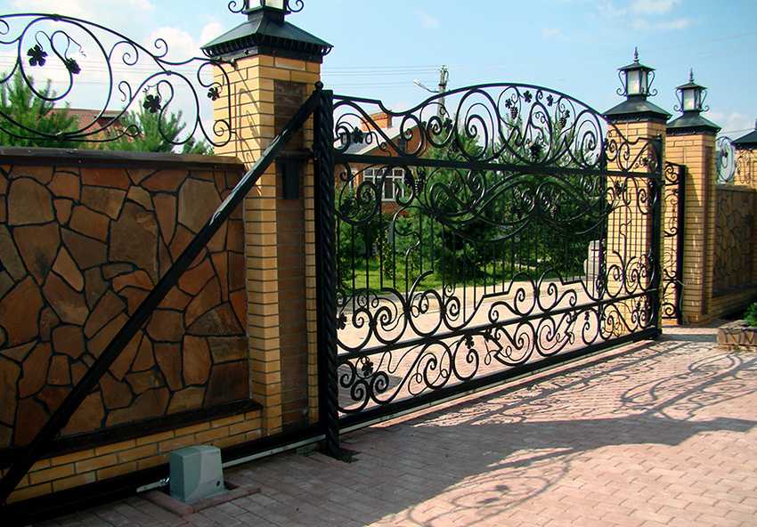 Подъемные ворота. Самый оригинальный вариант. На такие изделия устанавливается особый механизм. Во время открытия такие ворота поднимаются и заходят в постройку, освобождая проезд. Подобная конструкция имеет несколько минусов. Для ее установки требуются особые условия. Недостатком в этом случае является высокая цена кованых ворот. Откатные варианты являются наиболее приемлемыми, если необходимо организовать проезд в условиях ограниченного пространства.