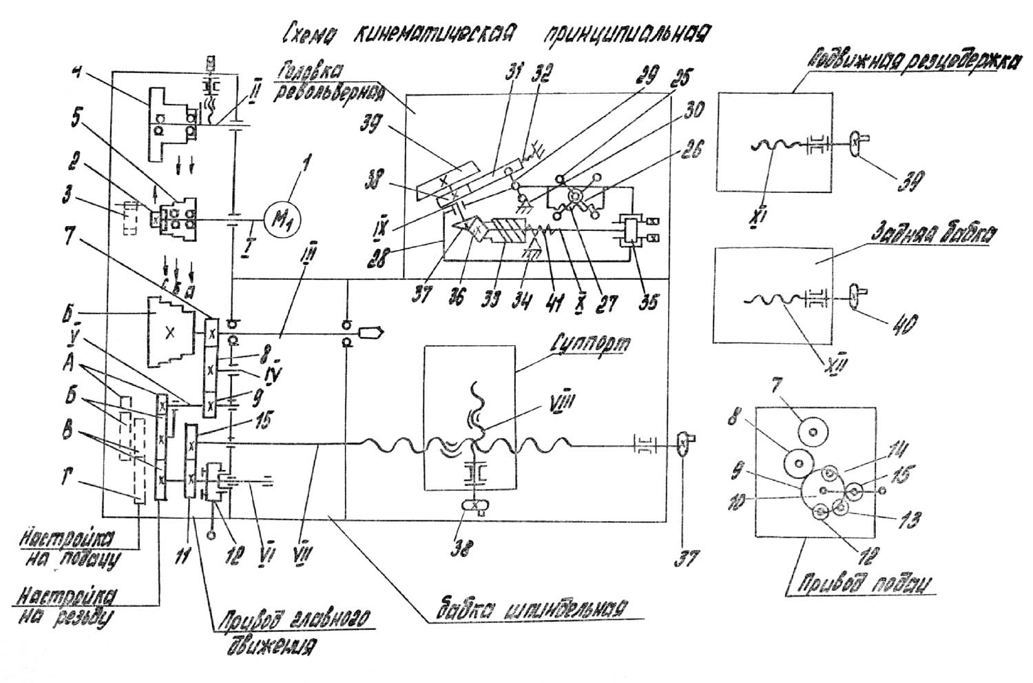 Поперечное перемещение суппорта осуществляется от маховичка 38 через винт VIII.