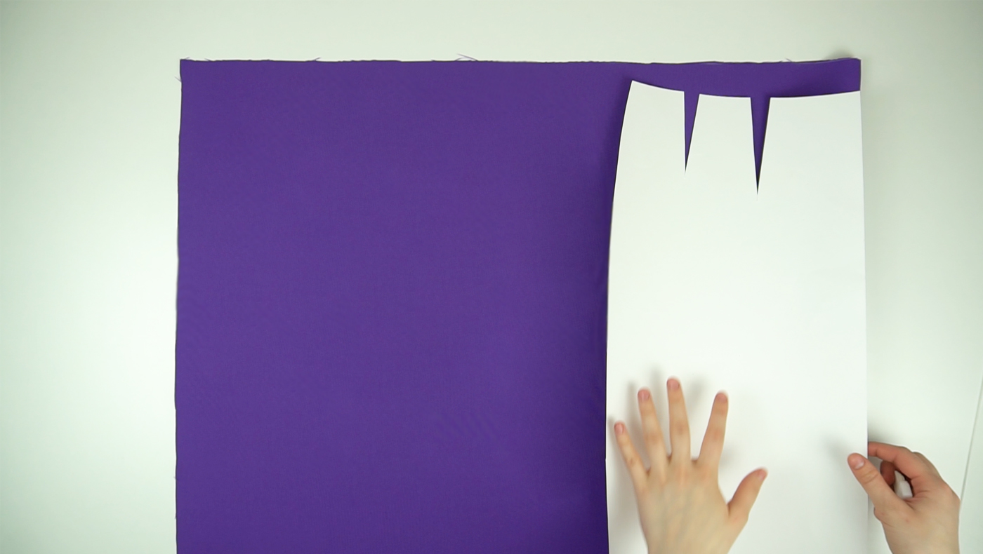 Выкройку нужно располагать таким образом, чтобы ее нижний край совпадал с ровным срезом. Учитывайте, что промежуток от края самой выкройки до низа ткани должен совпадать с расстоянием припуска на швы, подгиб.