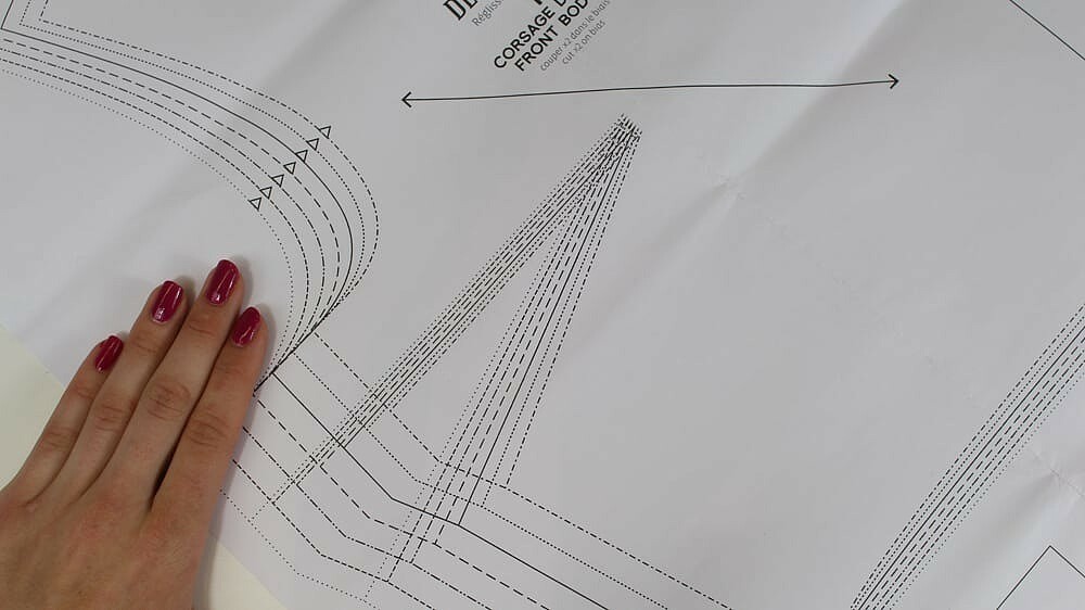 На выкройках Burda всегда указано направление долевой нити, но если вдруг вы шьете по выкройке, где направление нити основы не отмечено, имейте в виду: долевая нить ткани при раскладке должна быть строго параллельна позвоночнику — если только ваша модель не предполагает крой по косой. В этом случае мы раскладываем детали так, чтобы они шли под углом 45 градусов к долевой нити.
