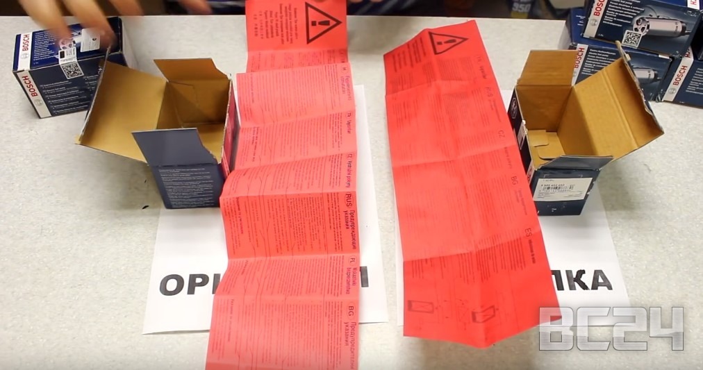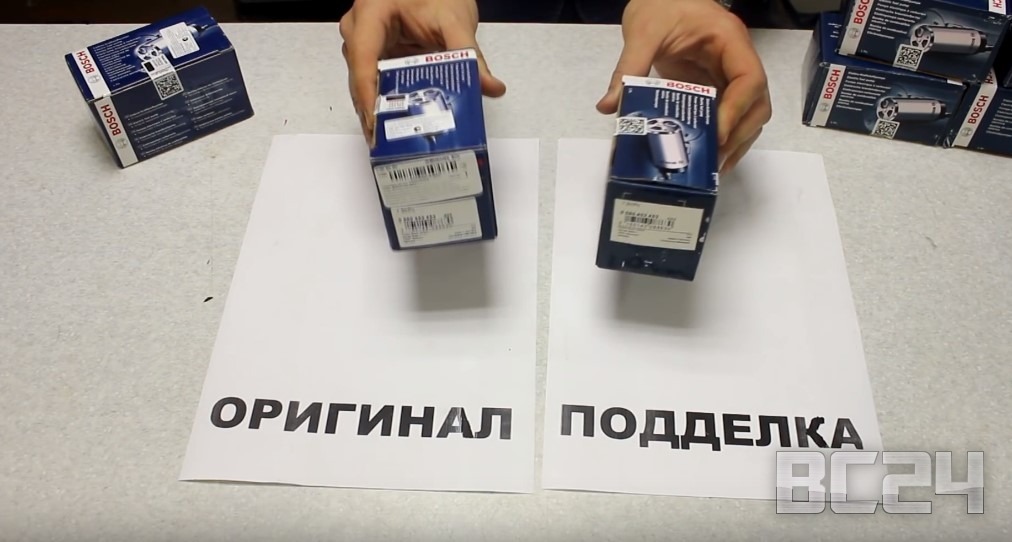 Когда в первый раз возьмешь коробки с бензонасосом БОШ в руки, сразу очень трудно сказать — где оригинал, а где подделка? Цветовая гамма, все наклейки и картинки идентичны у подделки с оригиналом.