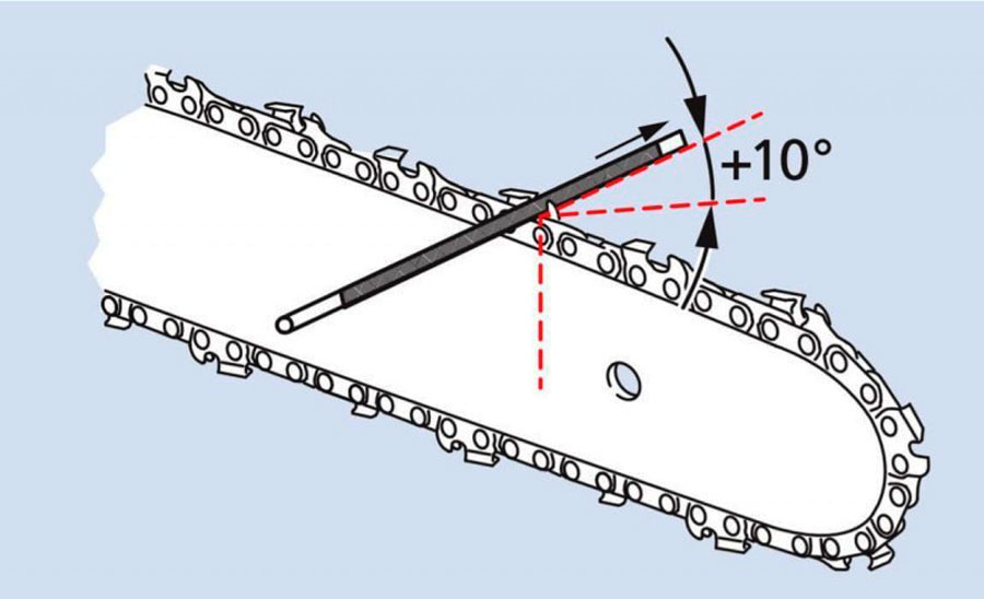 Круглый напильник устанавливается в перпендикулярном направлении при перемещении зубцов на цепи в вертикальном положении, если зубцы в горизонтальном положении — напильник устанавливается под углом от 15 до 200 градусов. Для горизонтальных зубцов можно использовать державку.