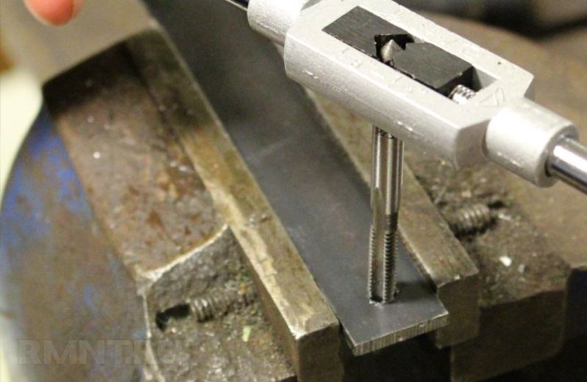 Для проверки точности нарезки резьбы используют угольник, проверяя вертикальность метчика после нескольких витков.