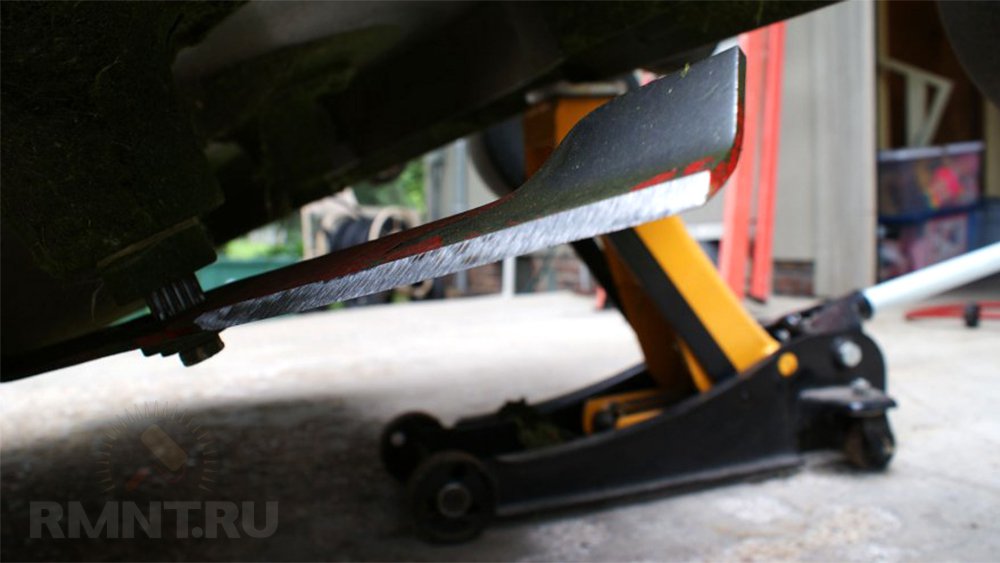 - Перед тем, как снять нож с газонокосилки, его фиксируют крепкой доской или поленом, упертым в землю. Необходимо, чтобы нож, когда его будут снимать, не двигался. Однако некоторые этой мерой безопасности пренебрегают и просто придерживают режущую пластину рукой.