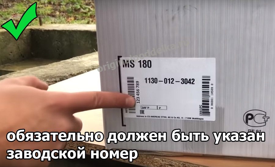 Обратите внимание на маркировку изделия. Серийный номер должен быть выбит на корпусе под глушителем и продублирован наклейками на пиле и упаковочной коробке.