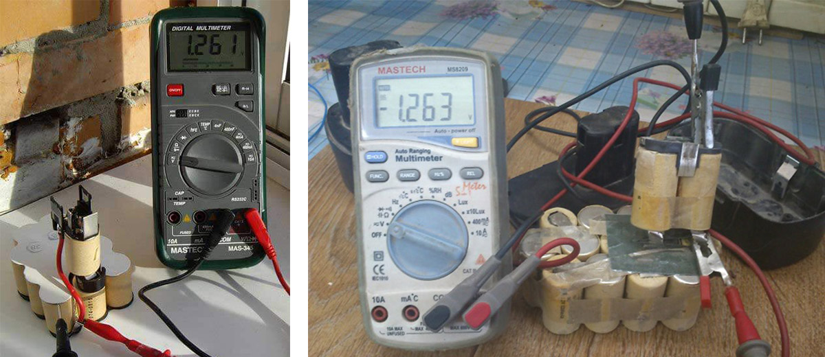 Напряжение секций заведомо исправной аккумуляторной банки одинаково, параметр зависит от типа элементов. Например, для единичной секции никель-кадмиевого типа нормативное напряжение составляет 1,2 В, для литий-ионной батареи — 3,6 В. Перед началом тестирования мультиметром проводится зарядка банки штатным устройством (с соблюдением рекомендаций изготовителя инструмента).
