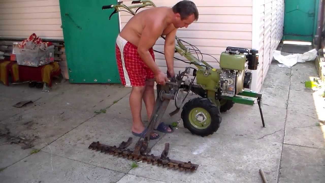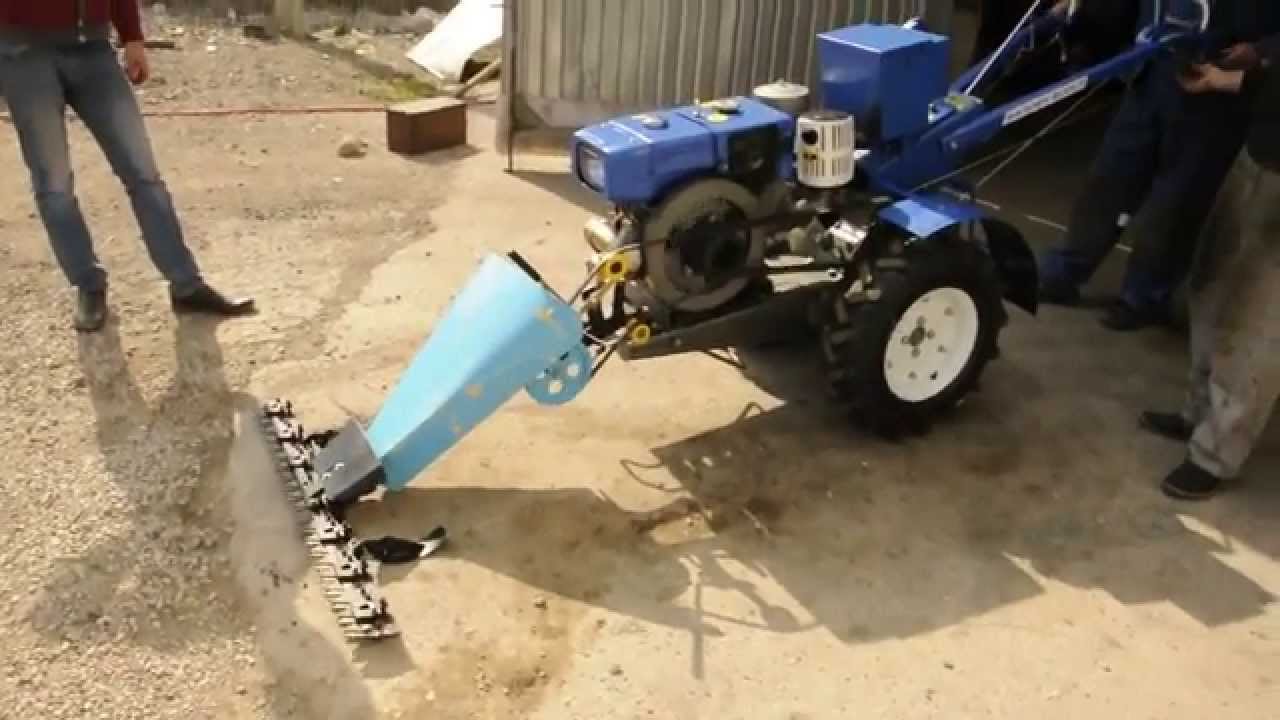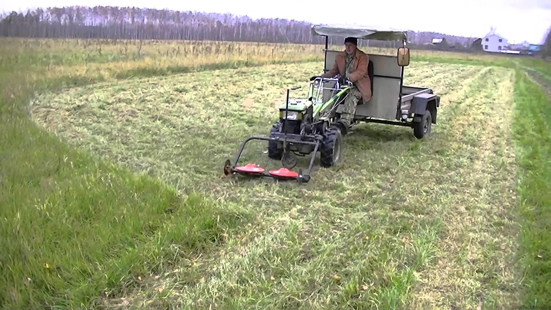 Далее связать косилку с валом отбора мощности мотоблока. Работу косилки-повозки можно посмотреть на представленном видео.