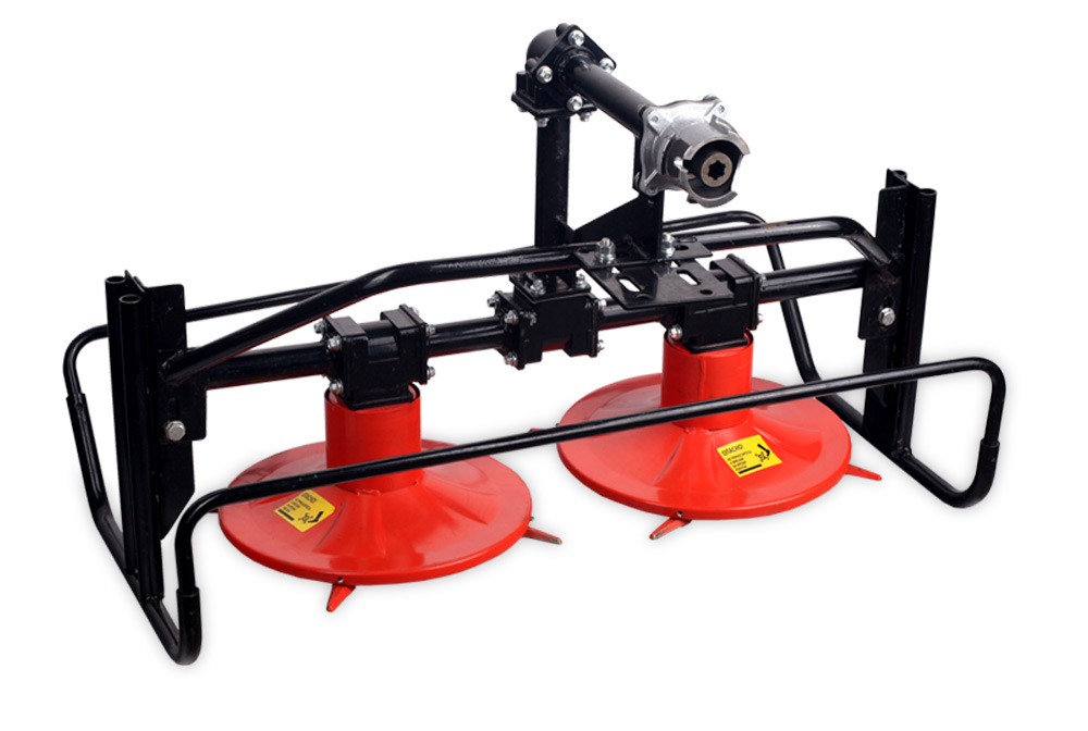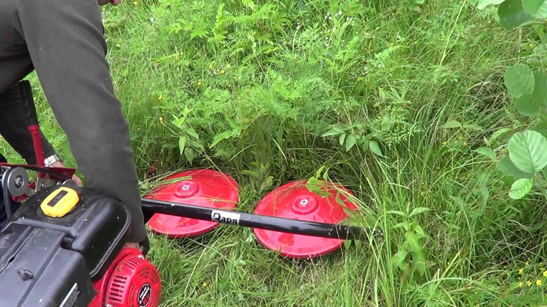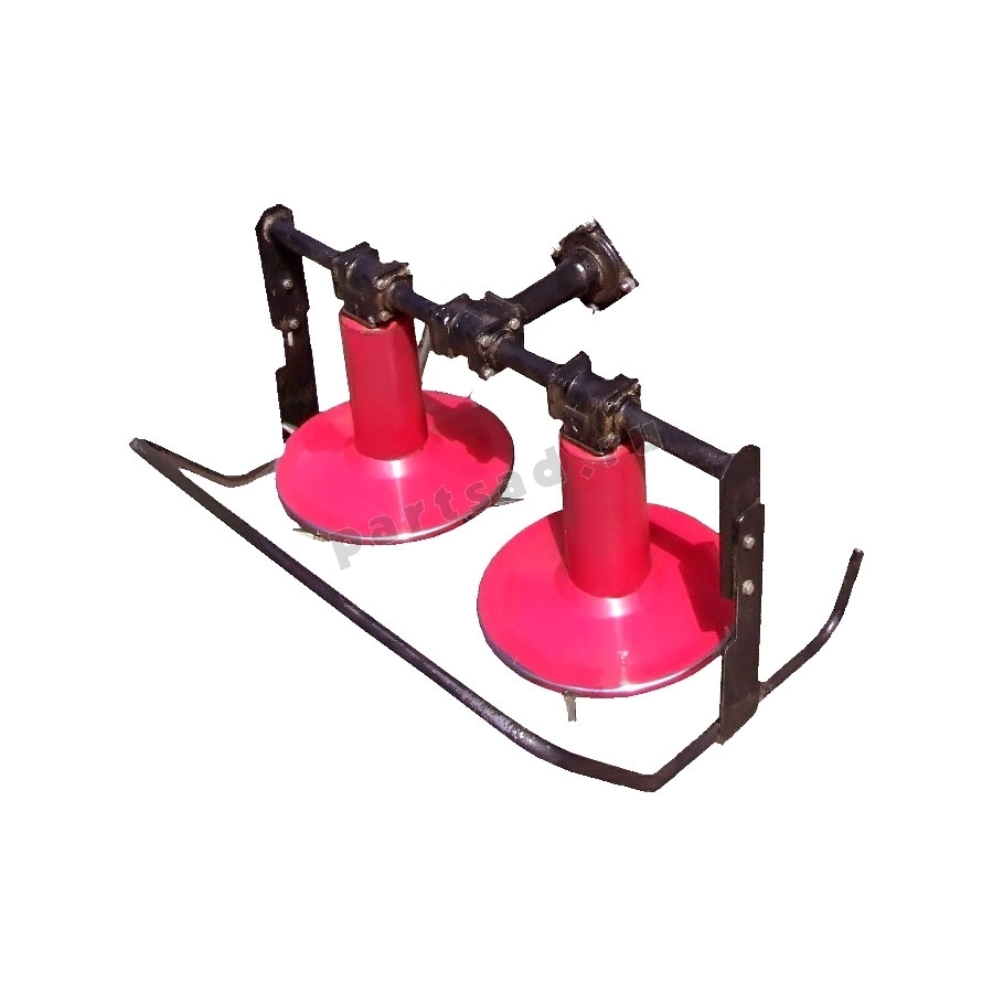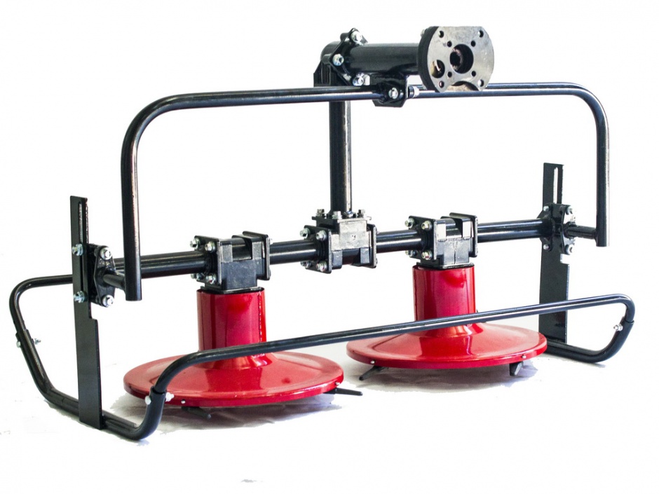 Внимание! Двухдисковый аппарат не намного сложнее однодисковой версии, но при эксплуатации, скашиваемая трава укладывается в валок, который формируется между дисками. В дальнейшем проще сгребать и транспортировать скошенную массу