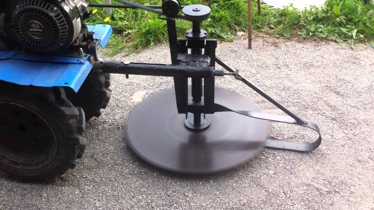 На неровных участках сравнительно небольшого размера применяют роторные косилки. Конструктивно они представляют диск, расположенный на высоте среза. Вращение от вала отбора мощности (ВОМ) мотоблока передается на исполнительный орган.