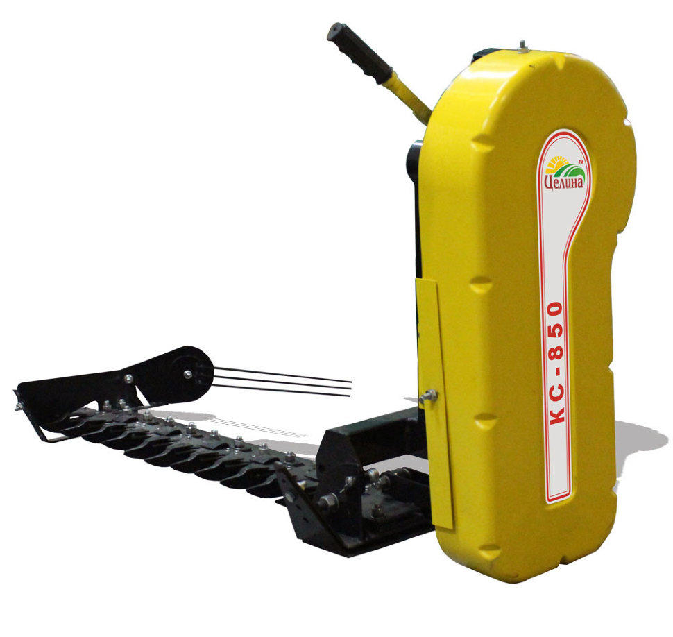 Необходимое усилие передаётся от вала двигателя мотоблока. В отличие от предыдущей модели, сегментные косилки обладают большей шириной охвата – до 1.1 метра.