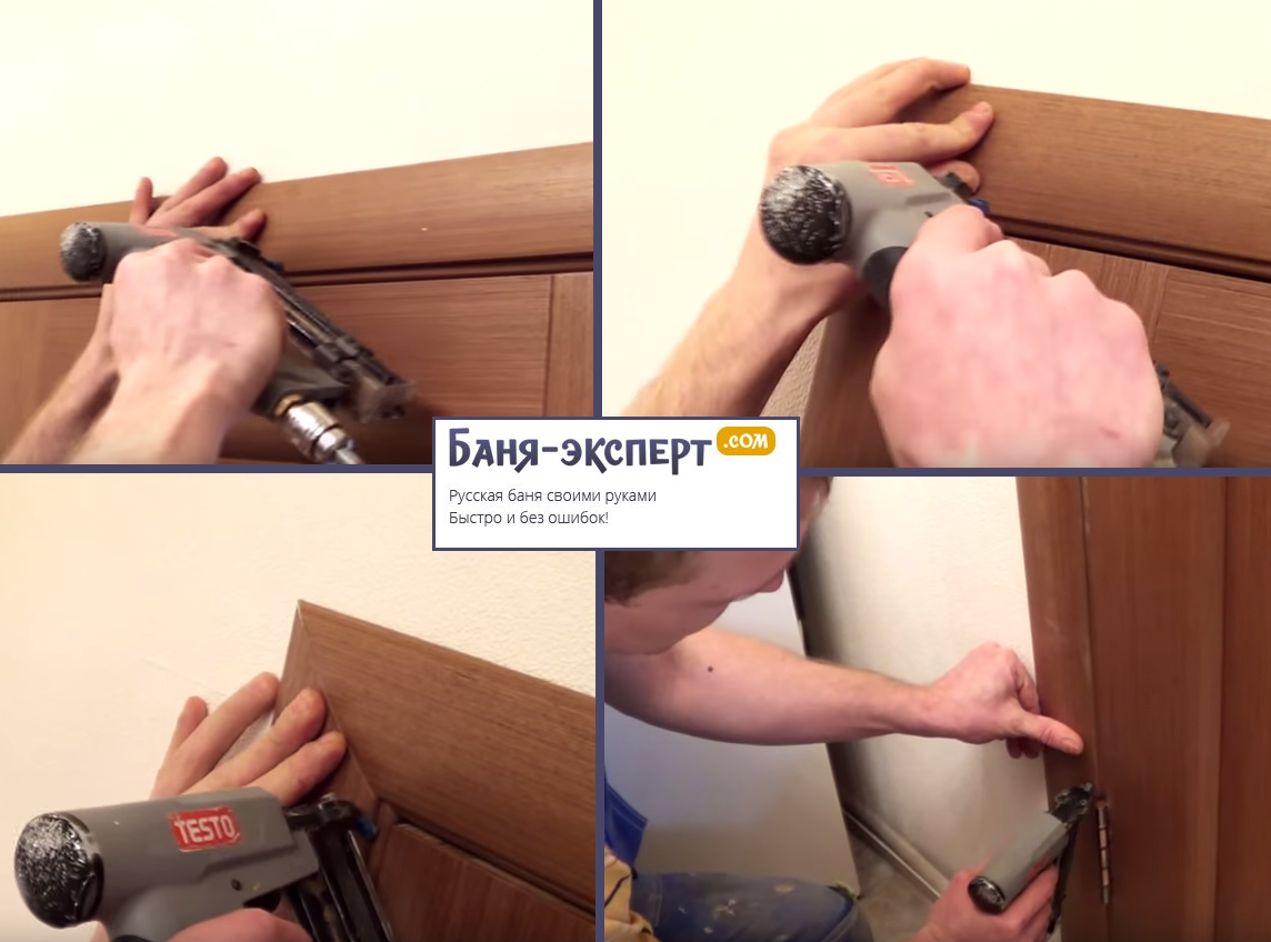 Крепление под 90 градусов делят куда реже. Оно проще, так как нет необходимости выполнять распил под углом и правильно стыковать обналичку. Достаточно просто правильно обрезать рейки по длине и закрепить любым из уже перечисленных способов.