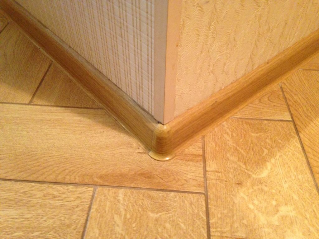 Все получившиеся зазоры в места склейки плинтусов лучше маскировать герметиком. При использовании шпаклевки стуки заделываются сразу, при оклейке. А чтобы избавиться от возможных зазоров в местах соединения багета и ПВХ-полотен, при приклеивании плинтуса немного поддавите багет вверх. Пленка слегка приподнимется и тщательно ляжет на плинтус.