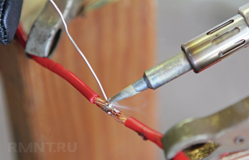 Во время пайки соединений одножильных проводов большого сечения можно использовать толстый пруток. При достаточном нагреве инструмента он тоже плавится быстро, но распределять его по спаиваемым поверхностям можно медленнее, стараясь заполнить все выемки скрутки.