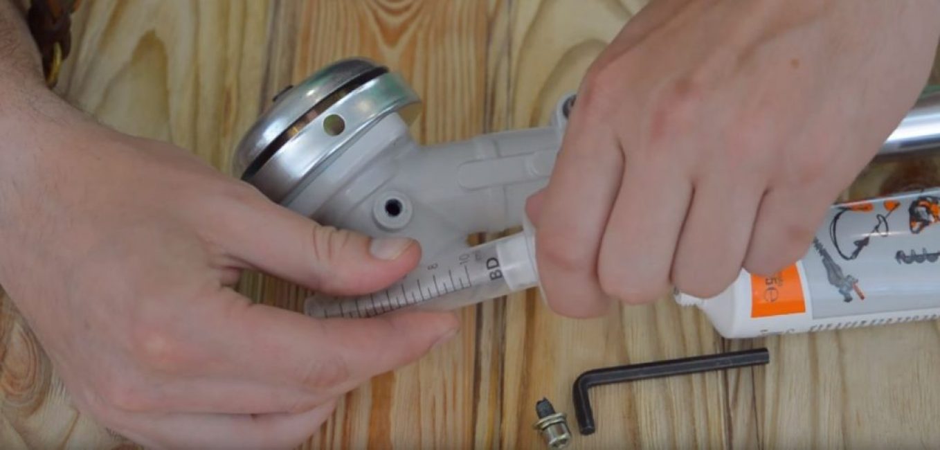 В верхней части корпуса, там, где установлен блок шестерней, имеется технологическое отверстие, которое при эксплуатации триммера заглушено винтом. Этот винт выкручивается, и в отверстие при помощи носика, имеющегося на тюбике, вводится 1,5…2 мл смазки. Если смазка была приобретена в другой расфасовке, то для данной операции подойдёт и обычный одноразовый медицинский шприц.