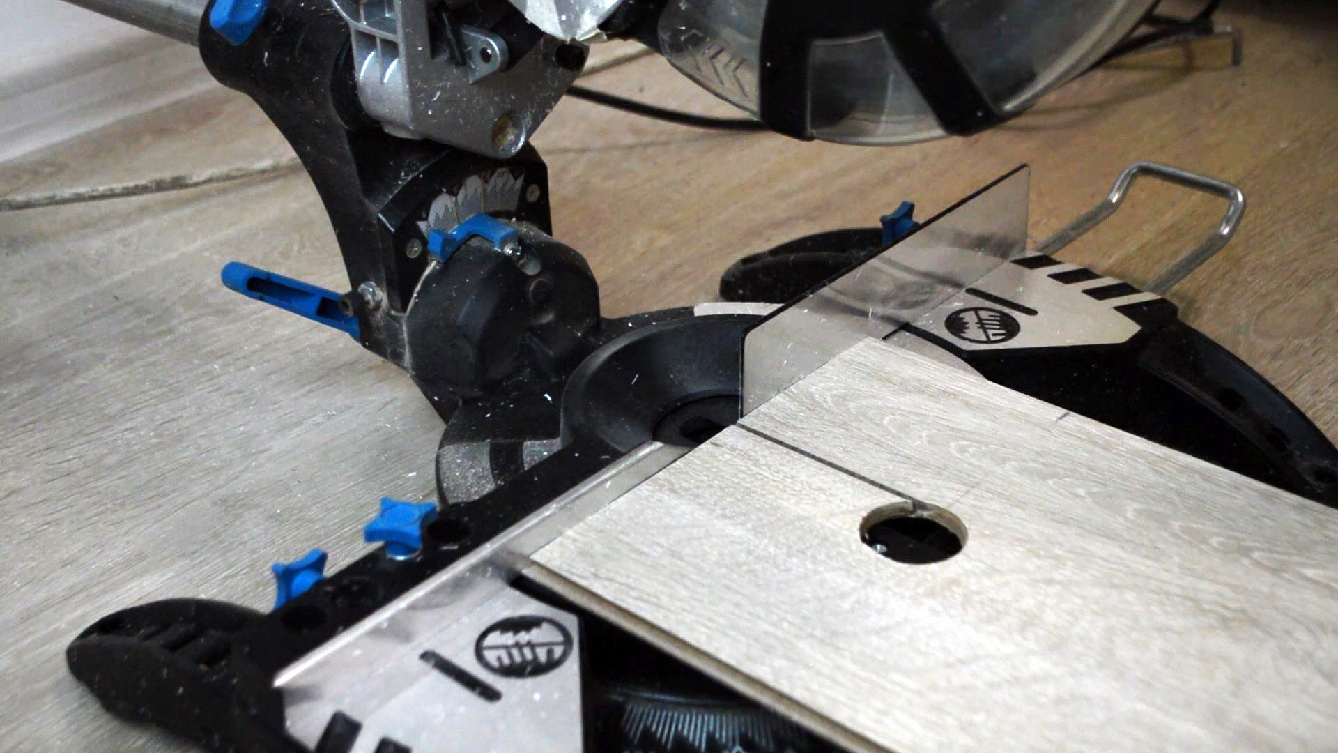 Важно! Стружку и пыль нужно собирать в процессе резки ламелей, иначе мельчайшая крошка из древесины набивается в пазы замков, и собрать напольное покрытие становится довольно сложно. Если использовать простейшие инструменты, например, нож или гильотину, то можно резать ламинат на полу, подложив тонкую фанерную дощечку, максимум 8 мм толщиной