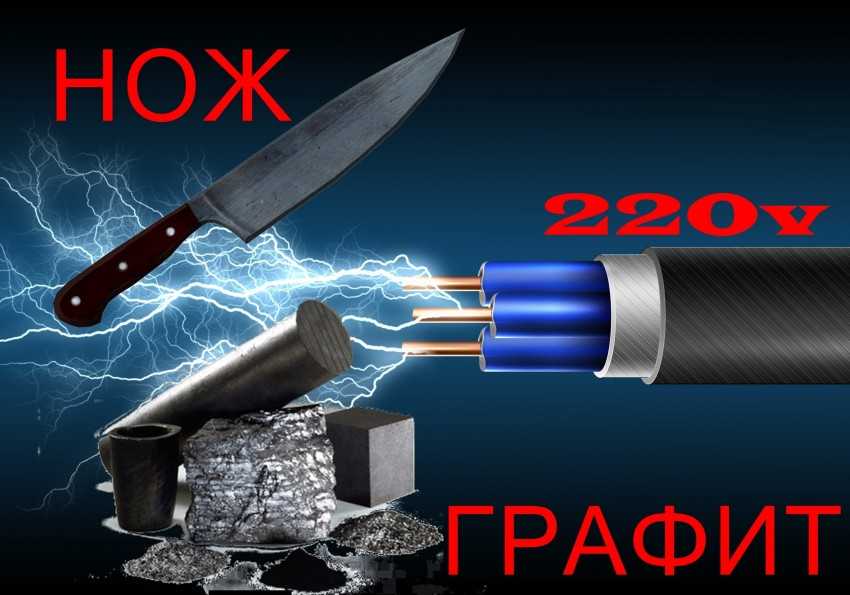 Такой способ хорошо применять для закалки именно кромки, которая постепенно соприкасается с графитом. Для этого, после всего выше сделанного, нужно включить источник питания и дать напряжение на наши детали. Нож нужно постепенно кромкой лезвия проводить по графиту.