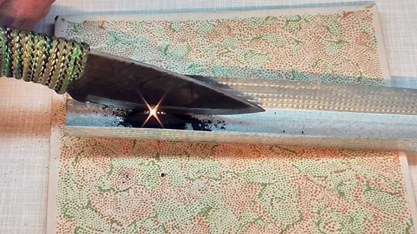 Увидеть этот цвет можно, если повернуть определенным образом поверхность металла к освещению. Проверяем твердость металла после отпуска, и убеждаемся, что лезвие стало чуть мягче. Как мы уже знаем, температура закалки У7 стали 800-830 градусов. И уменьшать ее нельзя.