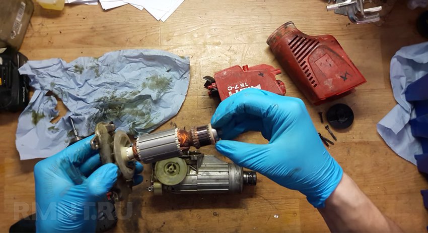Ремонт этих узлов допустимо выполнять только в условиях электротехнической мастерской. Допустимо выполнять эту работу и дома, но только при наличии специального оборудования и определённых знаний в части работы электродвигателя. Эта операция, выполненная в домашних условиях существенно удешевит ремонт перфоратора в целом.