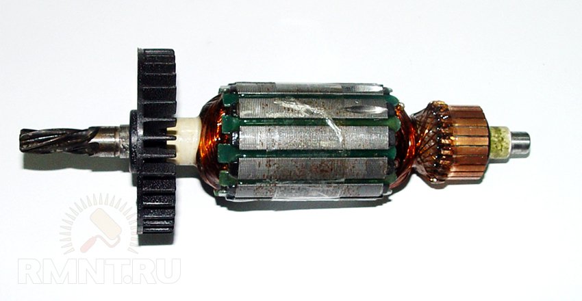 На валу ротора с одной стороны закреплена ведущая шестерня редуктора, затем следует подшипник и крыльчатка охлаждения, магнитопровод с обмотками, токосъёмник коллектора и ещё один подшипник. Наиболее уязвимые части этого узла — подшипники, которые преимущественно необслуживаемые и имеют небольшой ресурс из-за работы на высоких оборотах. Их износ сопровождается появлением постороннего шума при работе, вибрации и нагрева посадочных мест. Для замены подшипники нужно стянуть с концов вала, используя съёмник или оправку-рогатку, а затем установить новые, предварительно прогрев их феном. Не забывайте вернуть на место дистанционные и уплотнительные кольца в правильном положении.