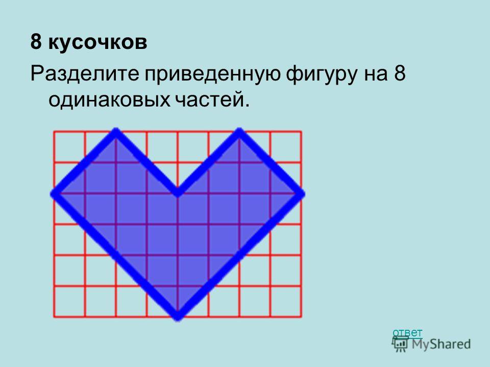 8 кусочков Разделите приведенную фигуру на 8 одинаковых частей. ответ
