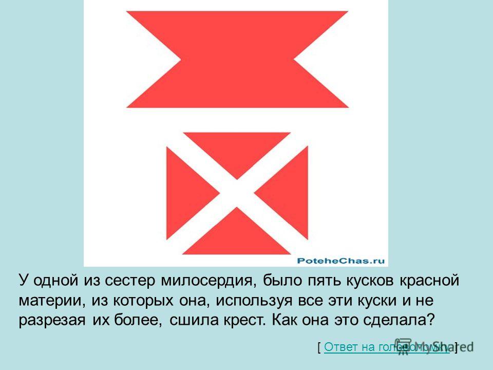 У одной из сестер милосердия, было пять кусков красной материи, из которых она, используя все эти куски и не разрезая их более, сшила крест. Как она это сделала? Ответ на головоломку
