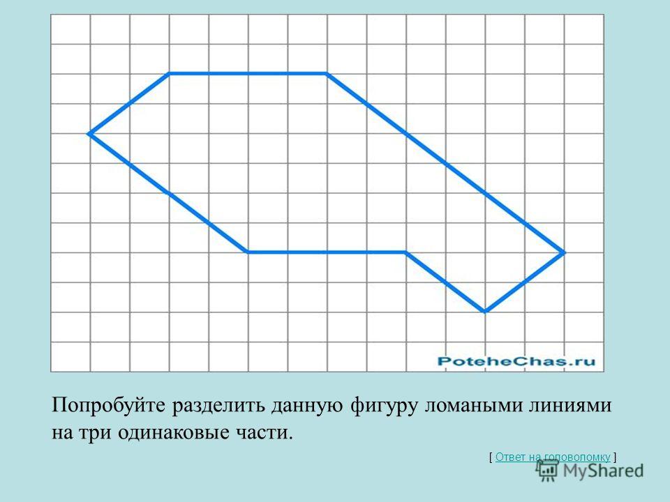Разделить фигуру на равные части Попробуйте разделить данную фигуру ломаными линиями на три одинаковые части. Ответ на головоломку