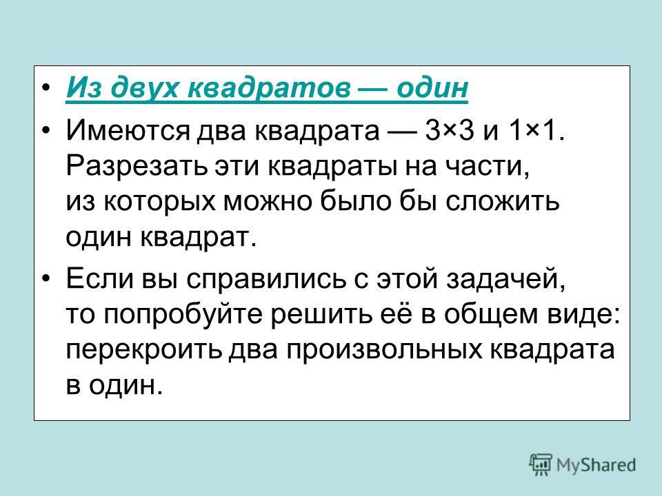 Из двух квадратов один Имеются два квадрата 3×3 и 1×1. Разрезать эти квадраты на части, из которых можно было бы сложить один квадрат. Если вы справились с этой задачей, то попробуйте решить её в общем виде: перекроить два произвольных квадрата в один.