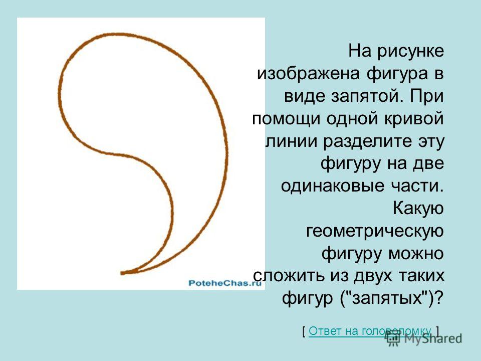 На рисунке изображена фигура в виде запятой. При помощи одной кривой линии разделите эту фигуру на две одинаковые части. Какую геометрическую фигуру можно сложить из двух таких фигур (“запятых”)? Ответ на головоломку